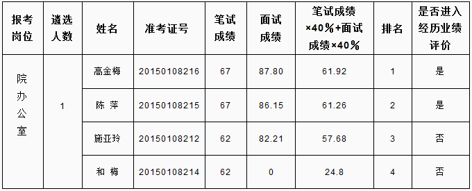 根據(jù)《怒江州2015年州級(jí)機(jī)關(guān)公開遴選公務(wù)員和參照公務(wù)員法管理單位工作人員公告》要求,面試由遴選單位負(fù)責(zé)實(shí)施,現(xiàn)將怒江州人民檢察院公開遴選公務(wù)員面試成績及進(jìn)入業(yè)績?cè)u(píng)價(jià)人員名單公告如下: