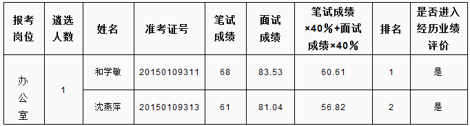 根據(jù)《怒江州2015年州級(jí)機(jī)關(guān)公開遴選公務(wù)員和參照公務(wù)員法管理單位工作人員公告》要求,面試由遴選單位負(fù)責(zé)實(shí)施,現(xiàn)將中共怒江州委黨史研究室公開遴選公務(wù)員面試成績(jī)及進(jìn)入業(yè)績(jī)?cè)u(píng)價(jià)人員名單公告如下: