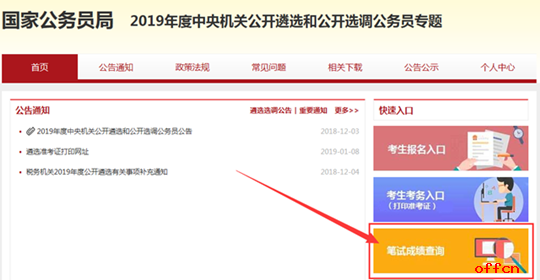 2019年度中央機關(guān)公開遴選和公開選調(diào)筆試成績查詢?nèi)肟谟?019年1月25日開通,可國家公務(wù)員局http://subb.scs.gov.cn/pp/gkweb/core/web/ui/business/home/lxhome.html進行查詢,1月25日網(wǎng)上公布筆試成績,考生可查詢筆試成績。中公遴選考試網(wǎng)整理了快捷報名通道進入網(wǎng)站查詢成績。
