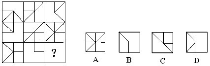 (解答:每行前兩個圖形疊加后,不同的部分就是第三個圖形。正確答案是D。)
