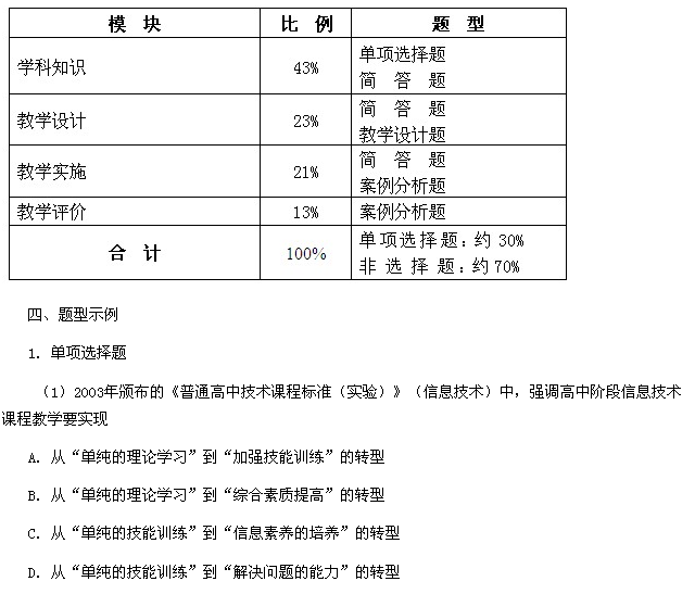 1.信息技術(shù)學(xué)科知識(shí)運(yùn)用能力。了解信息技術(shù)發(fā)展的歷史和現(xiàn)狀,把握國內(nèi)外信息技術(shù) 發(fā)展動(dòng)態(tài);掌握信息技術(shù)學(xué)科基本知識(shí)與技能,熟悉信息技術(shù)學(xué)科的特征與應(yīng)用領(lǐng)域;掌握信息技術(shù)學(xué)科教學(xué)的基本理論和方法,并能在信息技術(shù)學(xué)科教學(xué)中靈活運(yùn) 用;理解《普通高中技術(shù)課程標(biāo)準(zhǔn)(實(shí)驗(yàn))》(信息技術(shù))規(guī)定的課程目標(biāo)、教學(xué)內(nèi)容和實(shí)施建議,用以開展學(xué)科教學(xué)和指導(dǎo)學(xué)生實(shí)訓(xùn)實(shí)踐。