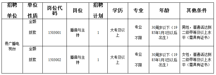 2015年度石臺縣廣播電視臺使用事業(yè)編制面向社會公開招聘播音主持人2名。根據(jù)《安徽省事業(yè)單位公開招聘人員暫行辦法》等規(guī)定,現(xiàn)將有關(guān)事項公告如下。