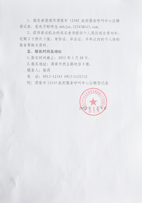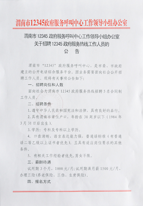 2015年陜西省渭南市12345政府服務(wù)熱線人員招聘5人公告【招5人】
