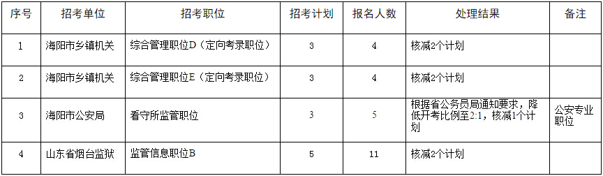 根據《2015年煙臺市各級機關及直屬單位考試錄用公務員公告》、《2015年煙臺市考試錄用公安機關人民警察公告》、《2015年煙臺監(jiān)獄考試錄用公務員 (人民警察)公告》等有關規(guī)定,煙臺市公務員考錄4個職位因繳費人數未達到規(guī)定開考比例,其錄用計劃予以核減,現予公告: