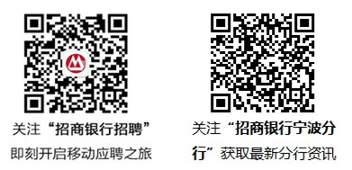 官方微信:掃描下方二維碼,關(guān)注“招商銀行招聘”微信公眾平臺,獲取的校園招聘信息,點(diǎn)擊“校園招聘”,申請感興趣的職位,投遞簡歷!