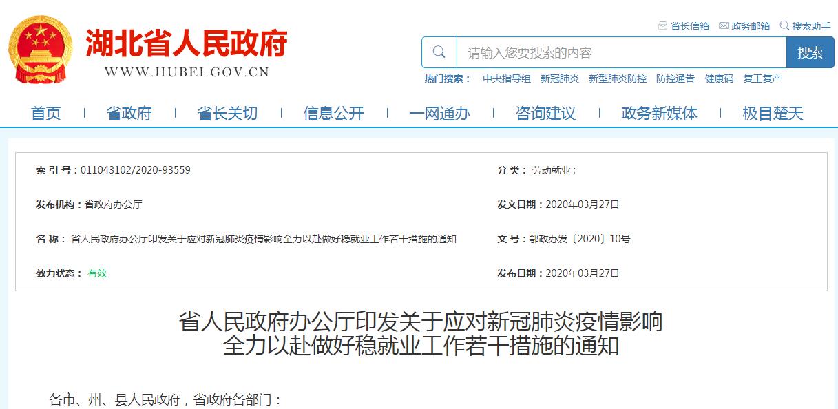3月27日,湖北省政府辦公廳印發(fā)《關(guān)于應(yīng)對(duì)新冠肺炎疫情影響全力以赴做好穩(wěn)就業(yè)工作的若干措施》,圍繞全力推動(dòng)安全有序復(fù)工返崗、支持企業(yè)減負(fù)穩(wěn)崗、促進(jìn)多渠道就業(yè)、促進(jìn)高校畢業(yè)生就業(yè)、推進(jìn)創(chuàng)業(yè)帶就業(yè)、實(shí)施就業(yè)扶貧、做好困難人員兜底、做實(shí)職業(yè)培訓(xùn)和就業(yè)服務(wù)、加強(qiáng)組織等9個(gè)方面,共計(jì)25條具體措施。