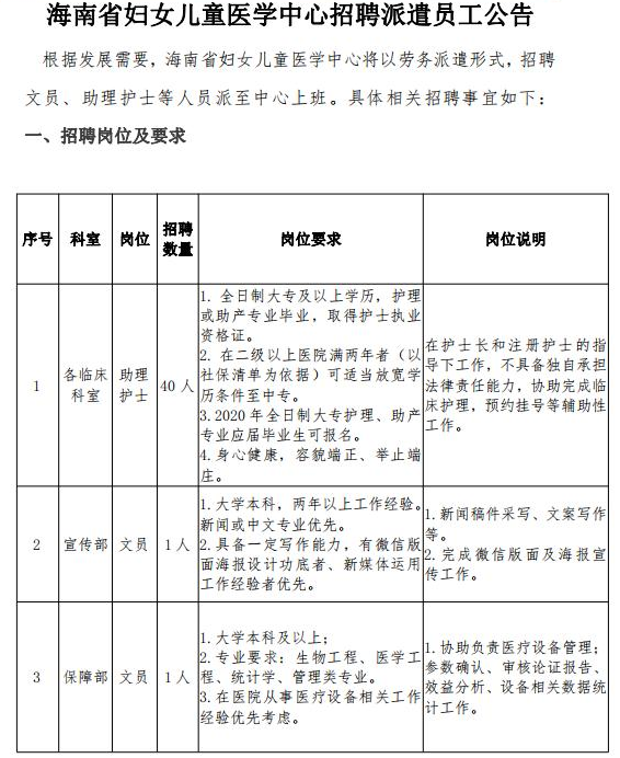2020海南省婦女兒童醫(yī)學(xué)中心招聘派遣員工公告助理護士、文員公告【招43人】