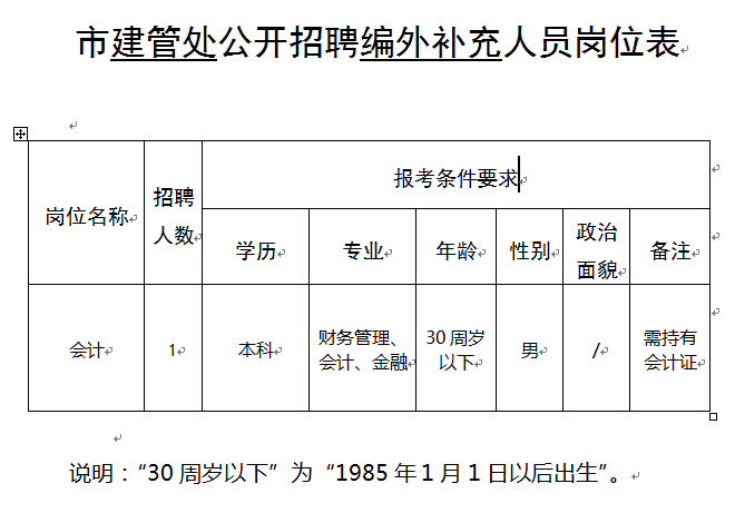 我處于2015年6 月16 日至6 月22 日在蕪湖人才網(wǎng)上發(fā)布了編外補(bǔ)充人員招聘公告,由于會(huì)計(jì)崗位現(xiàn)場(chǎng)報(bào)考人數(shù)不滿足要求,現(xiàn)將招聘條件予以調(diào)整,具體調(diào)整內(nèi)容見(jiàn)《市建管處公開(kāi)招聘編外補(bǔ)充人員崗位表》。