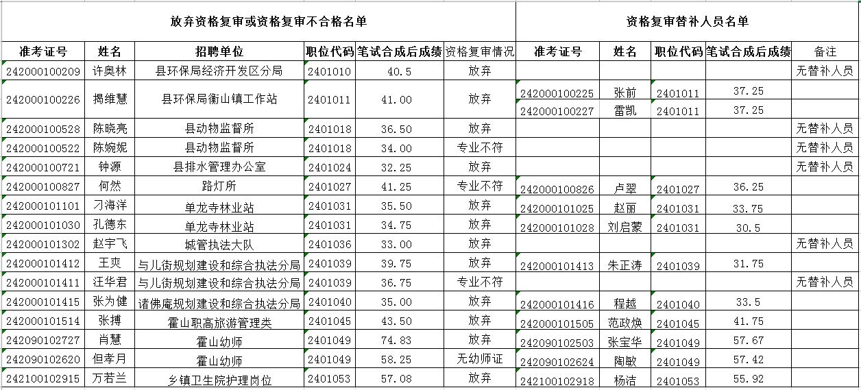 根據(jù)2015年霍山縣部分事業(yè)單位公開招聘工作人員公告規(guī)定,現(xiàn)將放棄資格復(fù)審、資格復(fù)審不合格人員及遞補(bǔ)人員名單公布如下,請?zhí)嫜a(bǔ)人員攜帶報(bào)名資格審查表、筆試準(zhǔn)考證、畢業(yè)證書、身份證及報(bào)考職位需要提供的資格證書原件及復(fù)印件,一寸照片3張,于7月2號(hào)到霍山縣人社局(地點(diǎn):霍山縣住建大廈9樓)參加資格復(fù)審,不按時(shí)參加替補(bǔ)資格復(fù)審者視為放棄。