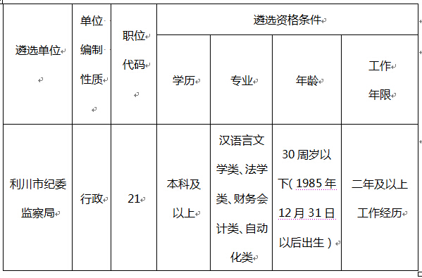 經(jīng)用人單位申請(qǐng),市公開遴選領(lǐng)導(dǎo)小組研究決定,增設(shè)利川市紀(jì)委監(jiān)察局公開遴選工作人員職位,計(jì)劃遴選工作人員2名,該職位除報(bào)名時(shí)間延長(zhǎng)至2015年7月10日上午12:00外,其余報(bào)考基本要求及報(bào)名、考試、考察、公示等程序要求與《利川市2015年市直單位第一次公開遴選公告(第1號(hào))》一致。職位具體條件如下: