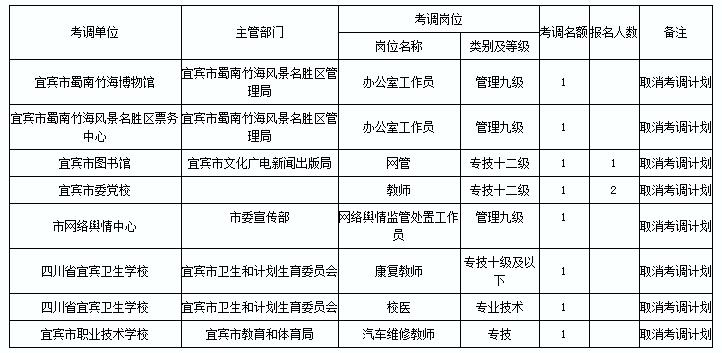 2015年上半年宜賓市市屬事業(yè)單位公開考調(diào)工作人員報名繳費工作已結(jié)束,根據(jù)各崗位考生報名情況,部分未達考調(diào)公告規(guī)定的最低開考比例或無人報考的崗位,按考調(diào)公告規(guī)定予以調(diào)減或取消?,F(xiàn)將調(diào)減取消的崗位公告如下: