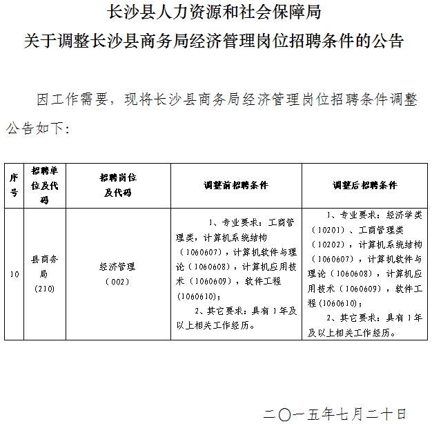 2015湖南長沙縣商務(wù)局經(jīng)濟管理崗位招聘條件調(diào)整公告