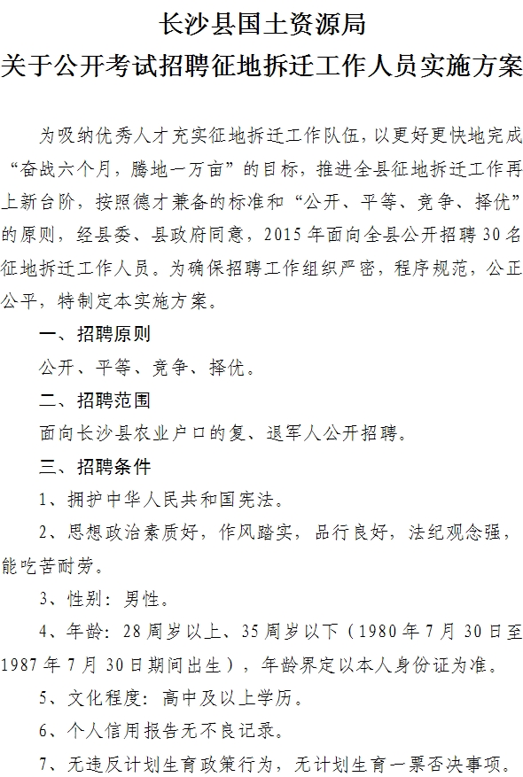 2015湖南長沙縣國土資源局考試征地拆遷人員招聘公告【招30人】