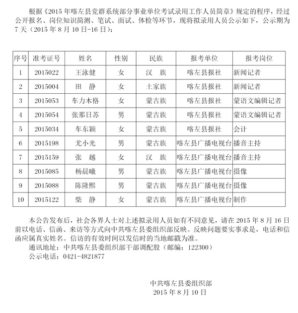 2015遼寧喀左縣黨群系統(tǒng)事業(yè)單位招聘錄用公告(六)