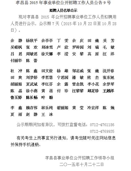 2015湖北孝昌縣事業(yè)單位招聘擬聘公告(9號)