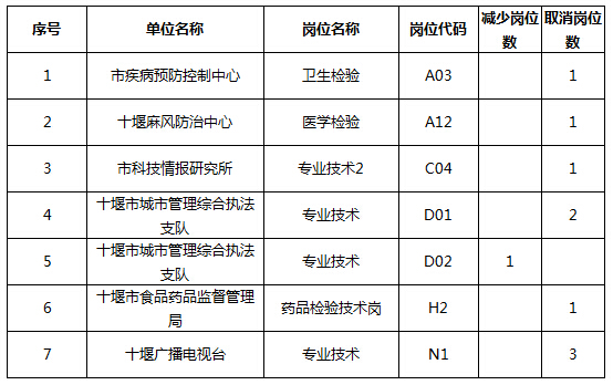 根據(jù)十堰市市直事業(yè)單位公開(kāi)招聘工作人員公告,因部分崗位報(bào)名人數(shù)達(dá)不到1:3的比例,現(xiàn)將崗位減少及取消情況公布如下: