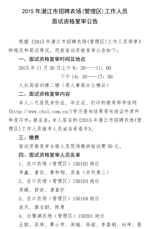 原標題:2015年潛江市招聘農場(管理區(qū))工作人員面試資格復審公告