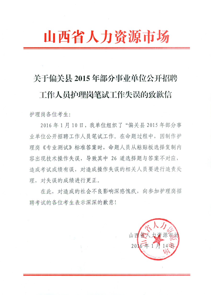 2015山西偏關縣事業(yè)單位招聘護理崗位筆試工作失誤的致歉信