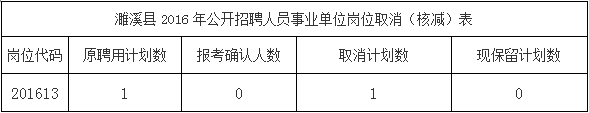 根據(jù)《濉溪縣2016年下半年公開招聘事業(yè)單位工作人員公告》要求,“報考崗位確認截止后,報考確認人數(shù)與招聘崗位數(shù)應不小于3:1的競爭比例。達不到競爭比例的崗位將予以取消或相應減少招聘崗位數(shù)”。現(xiàn)將被取消或核減的崗位予以公示。