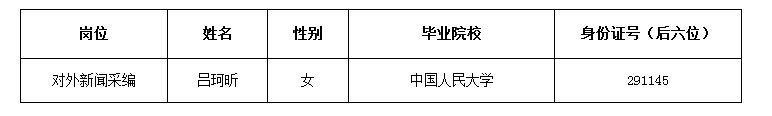 根據(jù)《農(nóng)民日報社公開招聘事業(yè)編制工作人員公告》安排,通過專業(yè)筆試、面試、體檢和考察等程序,經(jīng)研究,確定呂珂昕同志為擬錄用人選,相關信息如下:
