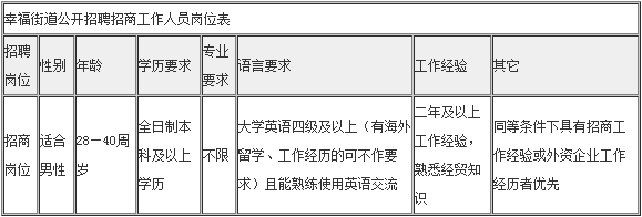 3. 具有應(yīng)聘崗位所需的管理能力和專業(yè)技術(shù)能力以及其它資格條件。(具體見《幸福街道公開招聘招商工作人員崗位表》)