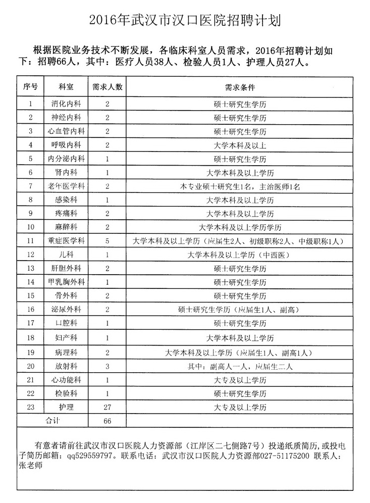 2016湖北武漢市漢口醫(yī)院招聘公告【招66人】
