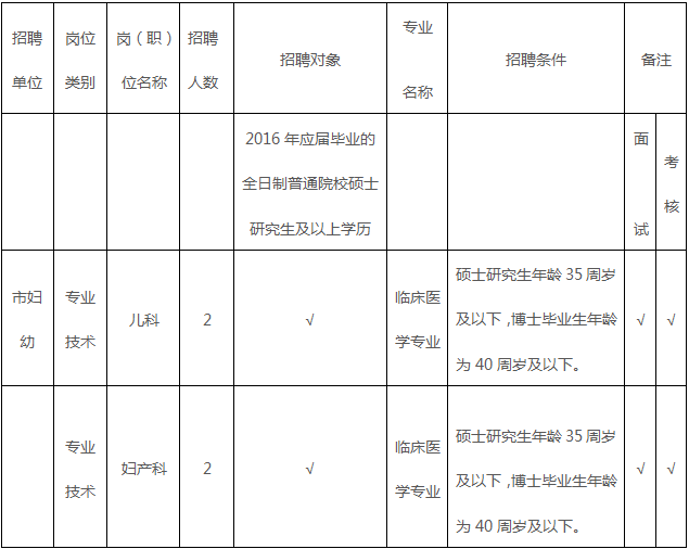 招聘工作人員4名。崗位條件詳情見《2016年度襄陽市婦幼保健院赴高校招聘緊缺專業(yè)人才崗位一覽表》(附后)。