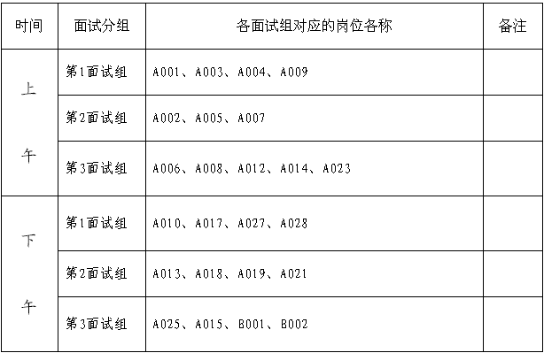 2、請各考生認真核對《面試分組安排》,根據(jù)報考的崗位名代碼確定自己的面試時間(上午或下午)和面試分組,切勿弄錯,否則后果自負。上午參加面試的考生請于4月22日上午7:50前,下午參加面試的考生請于4月22日下午12:50前,到與本人面試組相對應(yīng)的候試室集合。抽簽開始時仍未到達的,剩余簽號為該考生順序號;面試開始后仍未到達的,視為自動棄權(quán),取消面試資格。