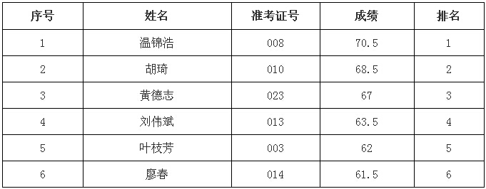 根據(jù)《贛州市政府法制辦下屬事業(yè)單位面向全市公開考選工作人員實(shí)施方案》有關(guān)要求,在市人力資源和社會(huì)局的監(jiān)督指導(dǎo)下,我辦于4月24日上午組織進(jìn)行了公開考選事業(yè)單位工作人員筆試工作。根據(jù)公開考選實(shí)施方案,按筆試成績(jī)從到低分1∶3的比例確定面試人選(與入闈最后一名成績(jī)并列者一并列入)的要求,現(xiàn)將入闈面試人員名單公告如下: