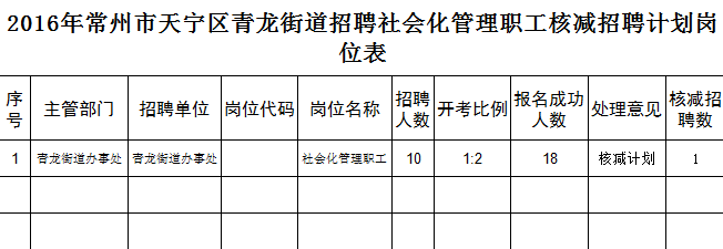 原標題:2016年常州市天寧區(qū)青龍街道招聘社會化管理職工核減招聘崗位的公告