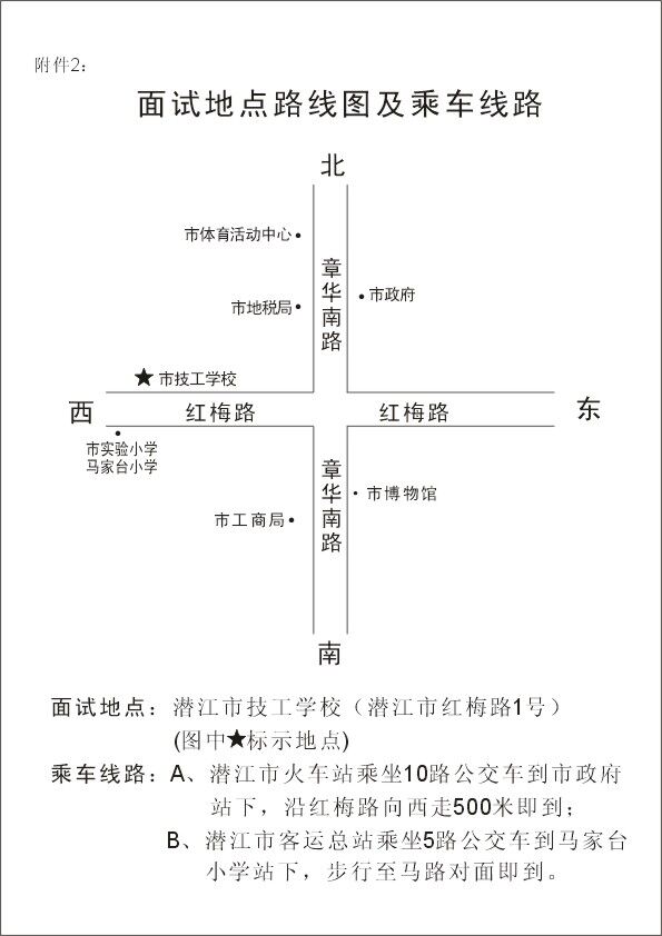中午12:00——12:30考生在潛江市技工(路線(xiàn)圖及乘車(chē)線(xiàn)路見(jiàn)附件2)教學(xué)樓一樓教室集合。