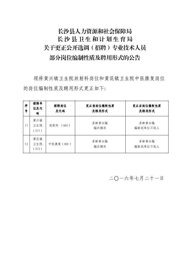 原標題:長沙縣人力資源和社會局長沙縣衛(wèi)生和計劃生育局關于更正公開選調(招聘)專業(yè)技術人員部分崗位編制性質及聘用形式的公告