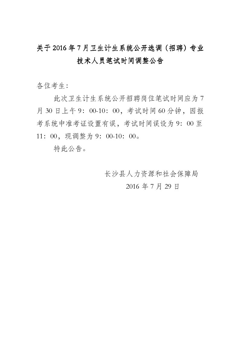2016年7月湖南長(zhǎng)沙市長(zhǎng)沙縣衛(wèi)生計(jì)生系統(tǒng)選調(diào)專(zhuān)業(yè)技術(shù)人員筆試時(shí)間調(diào)整公告