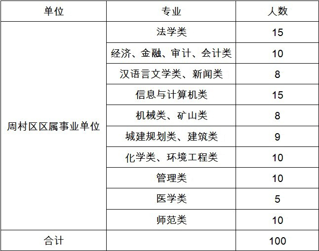 為加快實施人才強區(qū)戰(zhàn)略,進一步完善我區(qū)事業(yè)單位專業(yè)技術(shù)人員、管理人員隊伍結(jié)構(gòu),干部隊伍素質(zhì)。經(jīng)周村區(qū)委、區(qū)政府研究決定,面向全國招聘100名緊缺人才到周村工作?,F(xiàn)將有關(guān)事項公告如下: