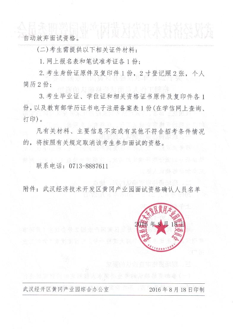 2016湖北武漢經(jīng)開區(qū)黃岡產(chǎn)業(yè)園管委會招聘面試資格確認通知