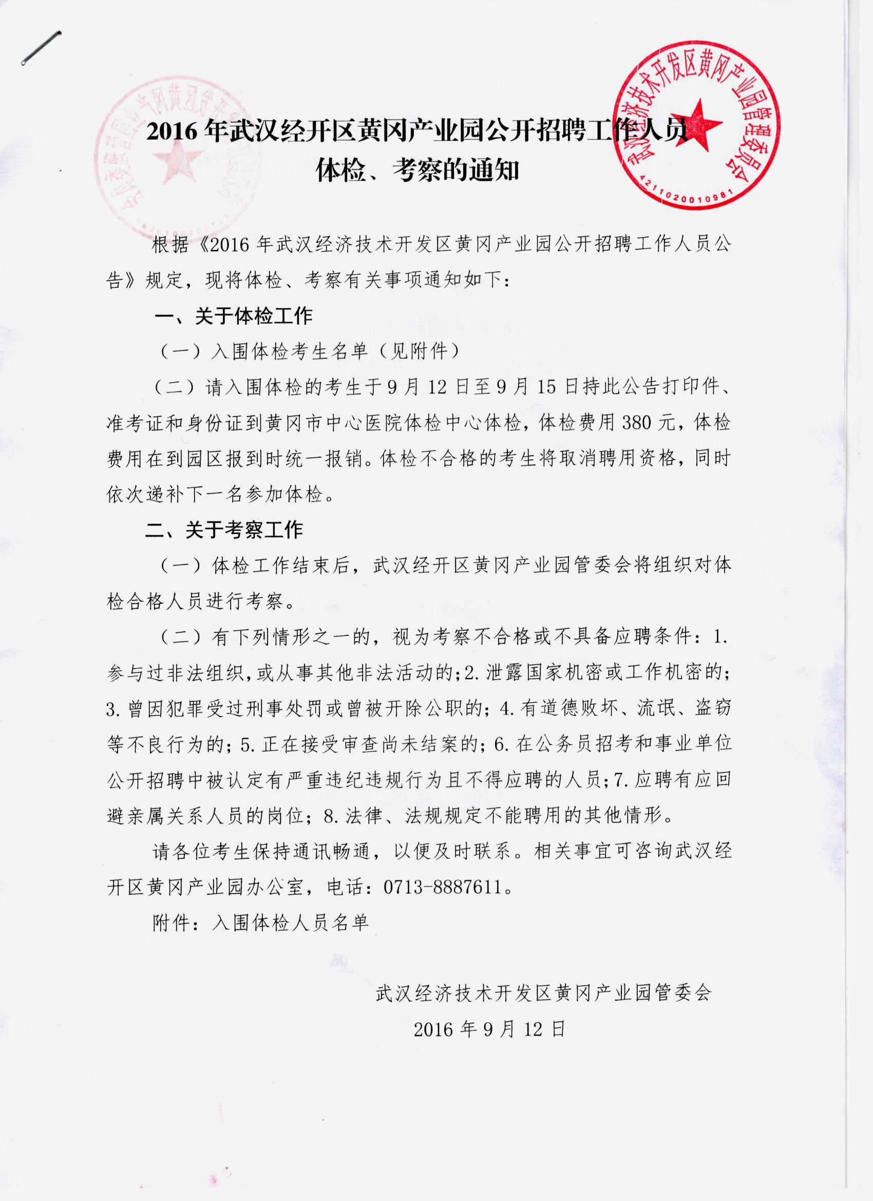 原標(biāo)題:2016年武漢經(jīng)濟開發(fā)區(qū)黃岡產(chǎn)業(yè)園管委會招聘工作人員入體檢、考察的通知