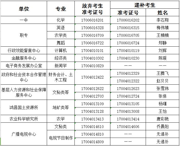 博愛縣2017年事業(yè)單位公開招聘工作在面試確認(rèn)階段,有16名考生因個(gè)人原因自愿放棄,根據(jù)《博愛縣2017年事業(yè)單位公開招聘工作人員簡(jiǎn)章》規(guī)定:擬招聘職位人數(shù)與面試人數(shù)不足1:3比例的,按照筆試成績(jī)從到低分依次遞補(bǔ)。現(xiàn)將放棄考生準(zhǔn)考證號(hào)和遞補(bǔ)考生名單公告如下: