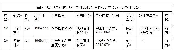 附表:海南省地方稅務系統擬補充錄用2013年考錄公務員及參公人員情況表