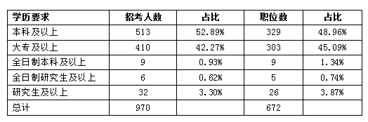從招錄學(xué)歷來看,學(xué)歷門檻要求“本科及以上”的職位占總職位數(shù)的50.3%,占總職位數(shù)的一半以上,考生們要注意的是有9人、9個(gè)職位數(shù)僅限全日制本科以上學(xué)歷,還有6人、5個(gè)職位要求全日制研究生及以上,如果是通過自學(xué)考試、函授、成人教育、網(wǎng)絡(luò)教育、夜大、電大等方式取得的學(xué)歷不能報(bào)考要求全日制學(xué)歷的職位。