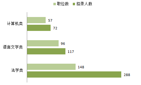 本次考試招錄中,法學(xué)類、語言文學(xué)類以及計(jì)算機(jī)類這三類專業(yè)需求量較大,其中尤以法學(xué)類專業(yè)人氣最旺,288個(gè)職位、148人招錄法學(xué)類人才,占到總職位數(shù)的22%,有法學(xué)類專業(yè)背景的考生有很大的選擇空間,要結(jié)合自身的學(xué)歷、資格證書等其他條件最終選出自己心儀的職位。