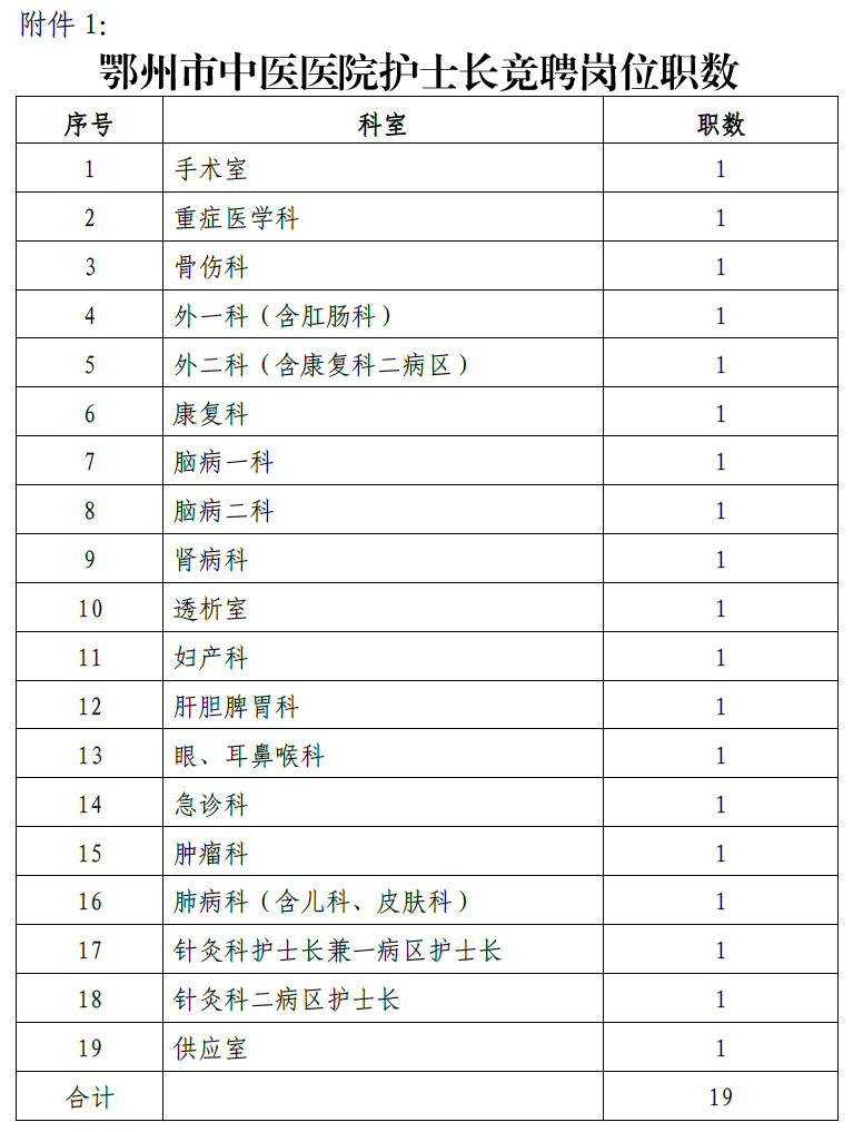 1.本次全院擬設(shè)護(hù)士長(zhǎng)崗位19個(gè)(詳見(jiàn)附件1)。