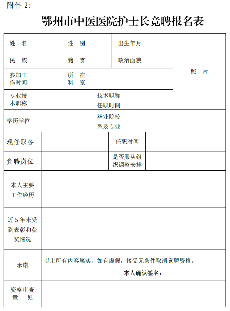 1.公開(kāi)職數(shù)、個(gè)人報(bào)名。在醫(yī)院網(wǎng)站、微信公眾號(hào)、職工QQ群等媒體平臺(tái)發(fā)布競(jìng)聘公告。根據(jù)公布的崗位職數(shù)和崗位條件,個(gè)人自愿填寫(xiě)《護(hù)士長(zhǎng)競(jìng)聘報(bào)名表》(見(jiàn)附件2)。