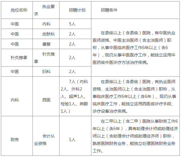 臨滄市中醫(yī)院此次公開選調(diào)事業(yè)編制崗位21名,其中:中醫(yī)崗位13人(內(nèi)科5人、皮膚科2人、婦科2人、康復(fù)2人、針灸推拿崗位2人)、西醫(yī)崗位7人(麻醉1人、內(nèi)科2人、外科2人、超聲1人、檢驗1人)、財務(wù)崗位1人。