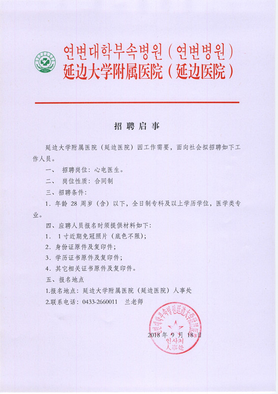 2018延邊大學附屬醫(yī)院招聘心電醫(yī)生公告