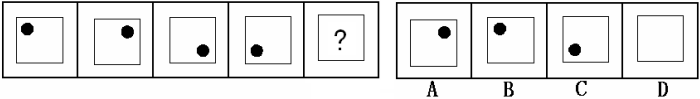 (答案:B。黑點在正方形中順時針移動。在第5個圖形中,應(yīng)該正好移動到左上角。)