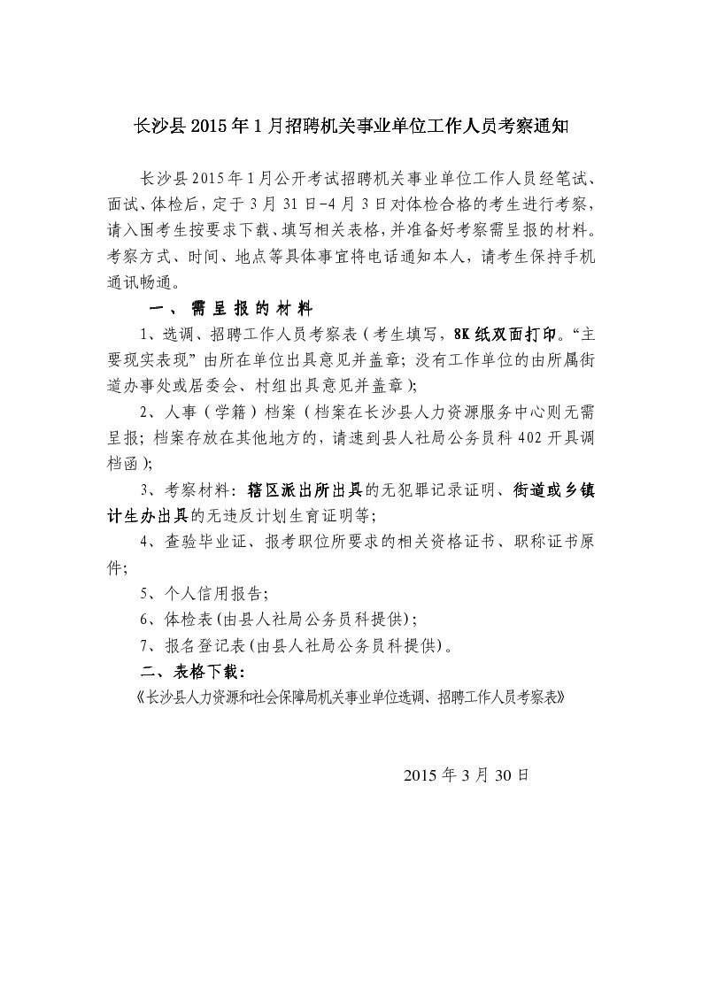 2015年1月湖南省長沙縣機(jī)關(guān)事業(yè)單位招聘考察通知