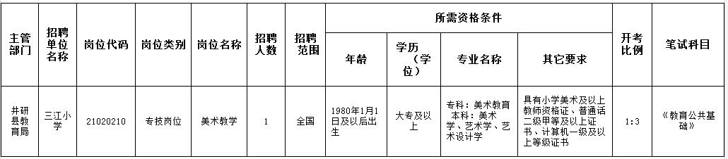 井研縣三江小學(xué)(崗位代碼:21020210)原公告“崗位名稱”一欄為“語文教學(xué)”更改為“美術(shù)教學(xué)”,原公告“其他要求”一欄為“具有小學(xué)語文及以上教師資格證、普通話二級(jí)甲等及以上證書、計(jì)算機(jī)一級(jí)及以上等級(jí)證書”更改為“具有小學(xué)美術(shù)及以上教師資格證、普通話二級(jí)甲等及以上證書、計(jì)算機(jī)一級(jí)及以上等級(jí)證書”,修訂后崗位條件和要求如下: