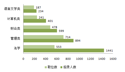 本次考試公檢法系統(tǒng)占據(jù)了“半壁江山”,該系統(tǒng)均為從事法律實(shí)務(wù)的工作者,因此,法律類相關(guān)人才就成為本次考試的主體,可謂是一場法學(xué)類專業(yè)的“盛宴”。法學(xué)類專業(yè)以1441人、553個(gè)職位于其他專業(yè)。除了法學(xué)類專業(yè),管理類、財(cái)會類等專業(yè)的招錄實(shí)力也比較可觀。