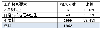 通過對基層工作經(jīng)驗的分析,中公網(wǎng)校專家發(fā)現(xiàn),招錄計劃中的1706人不要求工作經(jīng)歷,占到總?cè)藬?shù)的91.57%,其中有40人只招錄高校應(yīng)屆生,應(yīng)屆生們要重點考慮這類職位,縮小競爭對手范圍,概率。