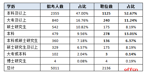 從上表可以看出,京考的學歷門檻并不高,本科學歷仍然是本次招錄的主體,1782個職位本科生可以報考,占總職位數(shù)的77.02%,大專學歷可報的職位也有243個,比去年高出14個,占到總職位數(shù)的11.38%,僅有4個職位要求博士研究生,而去年僅有1個職位要求博士學位,這說明京考對高學歷人才的需求日益增加,這4個職位來自北京市地方稅務局、北京市質(zhì)量技術(shù)監(jiān)督局、北京奧林匹克公園管委會,要求財政學、經(jīng)濟學、法學等相關(guān)專業(yè),符合條件的博士生可以重點考慮一下。